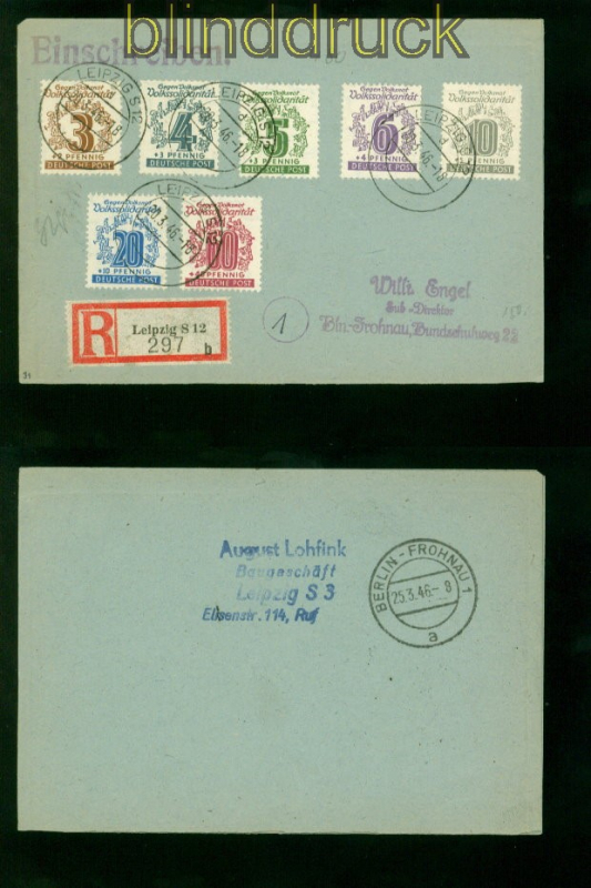 Sowjetische Besatzungszone West-Sachsen Mi # 138/41, 143, 146 und 149 Y auf R-Brief Leipzig 20.3.1946 nach Berlin-Frohnau 7 Marken Volkssolidarität portogerecht auf Einschreiben aus Leipzig 20.3.1946 nach Berlin-Frohnau Ankunftsstempel Erhaltung siehe Scan