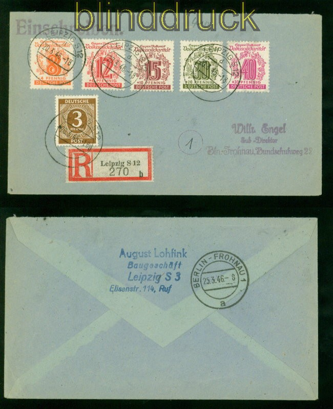 Sowjetische Besatzungszone West-Sachsen Mi # 142 I, 144/45, 147/78 und 913 mit 142 I auf R-Brief Leipzig 20.3.1946 nach Berlin-Frohnau 5 Marken Volkssolidarität mit Mi # 913 I. Kontrollratsausgabe mit Plattenfehler 142 I: Volksnor statt Volksnot portogerecht auf Einschreiben aus Leipzig 20.3.1946 nach Berlin-Frohnau Ankunftsstempel Erhaltung siehe Scan