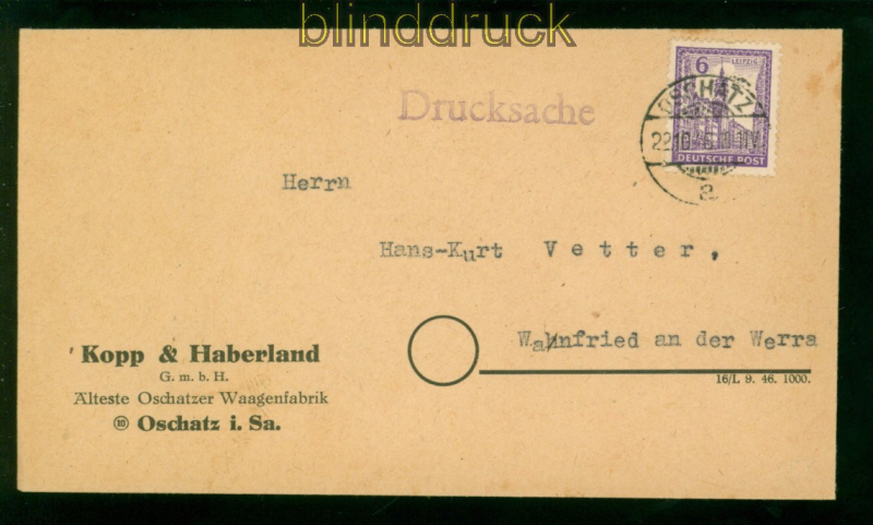 Sowjetische Besatzungszone West-Sachsen Mi # 153 x EF auf Drucksache Oschatz 23.10.1945 nach Wahnfried 6 Pfg. Abschiedsserie graues Papier portgerechte Einzelfrankatur EF Drucksache aus Oschatz 23.10.1945 nach Wahnfried Erhaltung siehe Scan