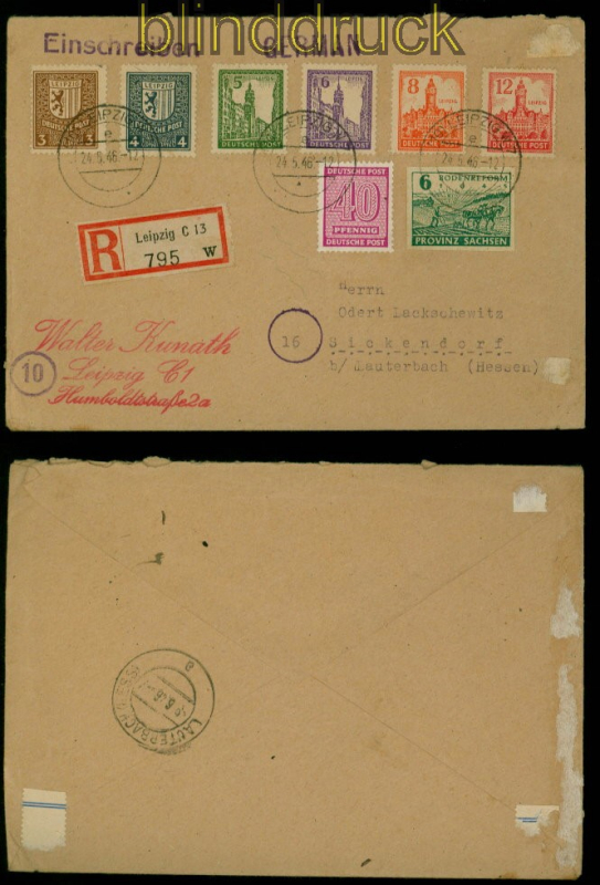 Sowjetische Besatzungszone West-Sachsen Mi # 156/61 x in MiF auf R-Brief Leipzig 24.5.1946 nach Sickendorf Abschiedsserie in Mischfrankatur auf R-Brief aus Leipzig 24.5.1946 nach Sickendorf Ankunftsstempel Erhaltung siehe Scan