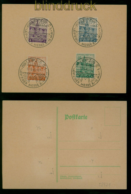 Sowjetische Besatzungszone Mi # 162 A X, 163 A Y b, 164 A Y und 165 A Y b gestempelt gepr. Dr. Jasch BPP Leipziger Messe mit Wasserzeichen komplette Ausgabe entwertet mit Messe-Sonderstempel SSt. auf Vorlagepostkarte geprüft Dr. Jasch BPP Erhaltung siehe Scan