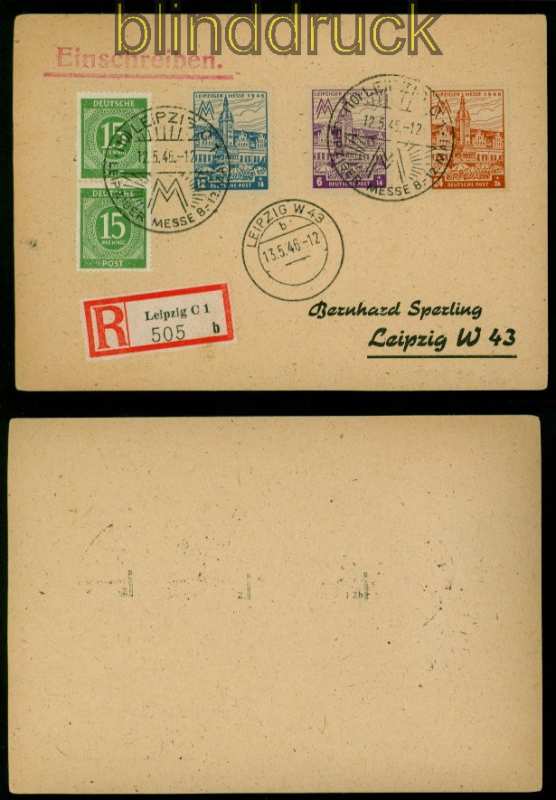 Sowjetische Besatzungszone Mi # 162 A z/164 A z mit # 163 I auf R-Karte Messe Leipzig geprüft Dr. Jasch BPP in Mischfrankatur 15 Pfg. Ziffern grün 1. Kontrollratsausgabe SBZ-Werte rückseitig geprüft Dr. Jasch BPP auf Orts-R-Postkarte mit Messe-Sonderstempel SSt. 12.5.1946 Erhaltung siehe Scan