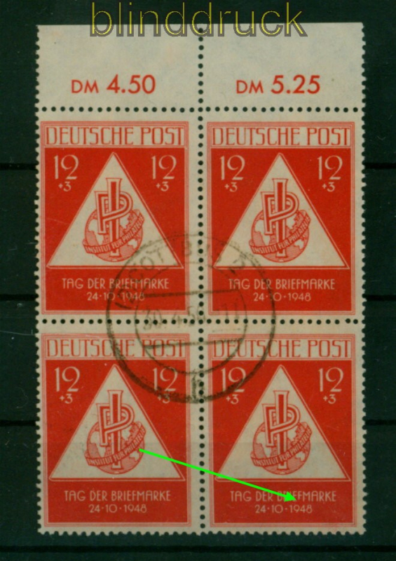 Sowjetische Besatzungszone Mi # 228 II gestempelt im Oberrand-4er-Block Tag der Briefmarke 12 + 3 Pfennig Tag der Briefmarke mit Plattenfehler II: F in Briefmarke unten kurz im Oberrand-4er-Block zentrisch gestempelt Erhaltung siehe Scan