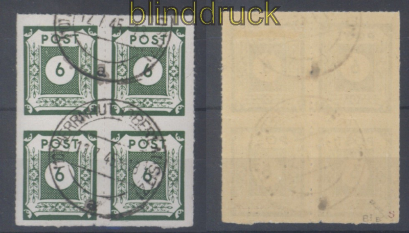 Sowjetische Besatzungszone Ost-Sachsen Mi # 43 B I 4er-Block gestempelt geprüft Jasch BPP 6 Pfg. Ziffern schwarzgelbgrün mit amtlichen Durchstich 4er-Block gestempelt geprüft Jasch BPP Erhaltung siehe Scan