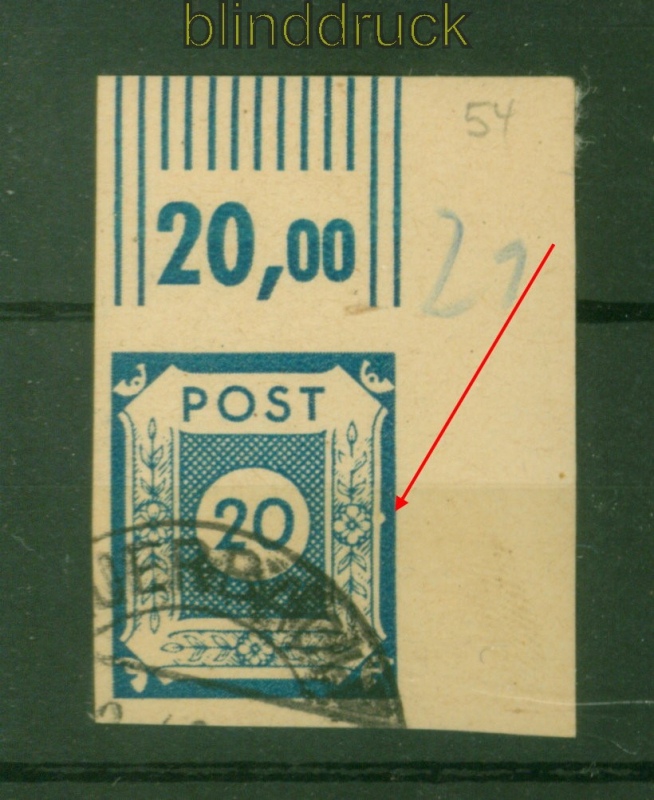 Sowjetische Besatzungszone Mi # 54 a II gestempelt Plattenfehler II 20 Pfg. Ziffernserie 20 Pfennig Ziffernserie blau gestempelt Plattenfehler II: weißer rechter Rand neben Blüte mit Beule Feld 10 Erhaltung siehe Scan