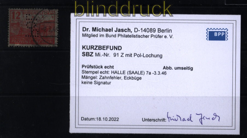 Sowjetische Besatzungszone West-Sachsen Mi # 91 Z POL gestempelt Kurzbefund Dr. Jasch BPP 12 Pfennig Bodenreform Zigarettenpapier Wasserzeichen Z mit POL-Lochung gestempelt Kurzbefund Dr. Jasch BPP: Stempel echt Halle (Saale) 7 a 3.3.1946, Zahnfehler, Eckbüge seltene POL-Lochung Erhaltung siehe Scan