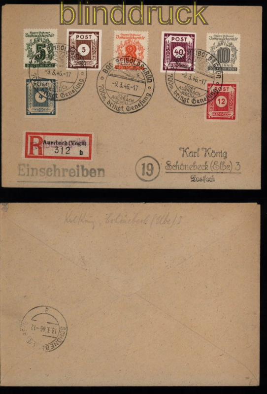 Sowjetische Besatzungszone MiF verschiedener Ausgaben R-Brief SSt. Bad Beiboldsgrün 9.3.1946 portogerecht auf R-Brief aus Bad Beiboldsgrün 9.3.1946 nach Schönebeck mit Not-R-Zettel Auerbach (Vogtl.) Sonderstempel SSt. Ankunftsstempel Erhaltung siehe Scan