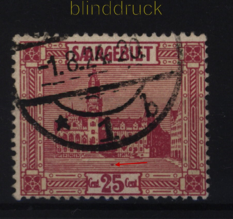 Saargebiet Mi # 100 IX gestempelt Plattenfehler Punkt vor Treppe 25 C. Landschaftsbilder (IV) mit Plattenfehler IX: markanter Punkt vor der Treppe über der Wertangabe gestempelt Erhaltung siehe Scan