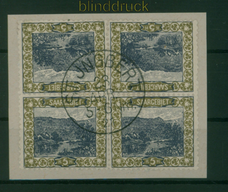 Saargebiet Mi # 53 A Kdr. IV (2) gestempelt 4er-Block Kehrdruck 5 Pfennig C. Landschaftsbilder (I) zwei Kehrdruckpaare im 4er-Block Type IV zentrisch gestempelt St. Ingbert 23. APR 21 auf Briefstück Erhaltung siehe Scan