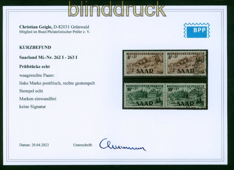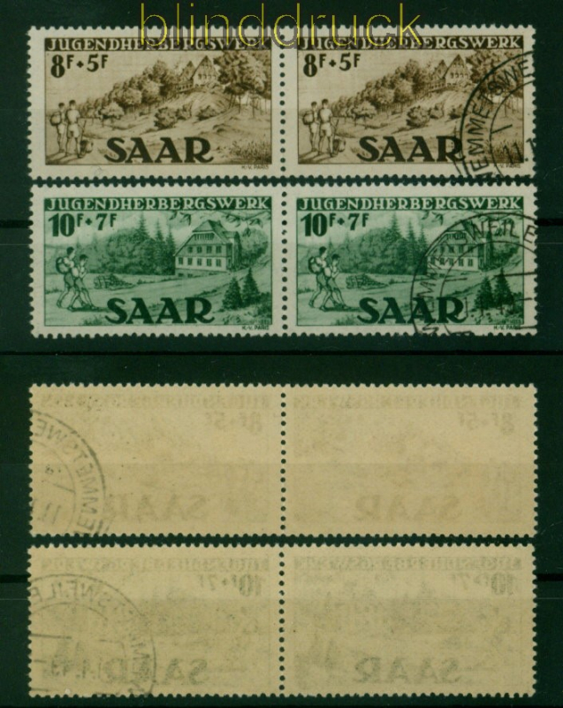 Saarland Mi # 262/63 postfrisch und gestempelt im Paar KB Geigle BPP Jugendherbergswerk komplette Ausgabe in waagerechten Paaren linke Marke postfrisch, rechte Marke gestempelt Kurzbefund Geigle BPP: Stempel echt, Marken einwandfrei Erhaltung siehe Scan