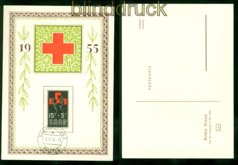 Saarland Mi # 360 FDC-Karte Rotes Kreuz 1955 Ausgabe Rotes Kreuz 1955 auf Schmuck-FDC-Karte sauber gestempelt Saarbrücken 2 Ersttag 5.5.55 nicht adressiert Erhaltung siehe Scan