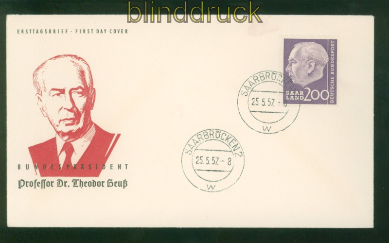 Saarland Mi # 399 FDC 200 Pfennig Theodor Heuss Ersttagsbrief 200 Pfennig Dauerserie Theodor Heuss auf Schmuck-FDC-Karte sauber gestempelt Saarbrücken 2 Ersttag 25.5.1957 nicht adressiert Erhaltung siehe Scan