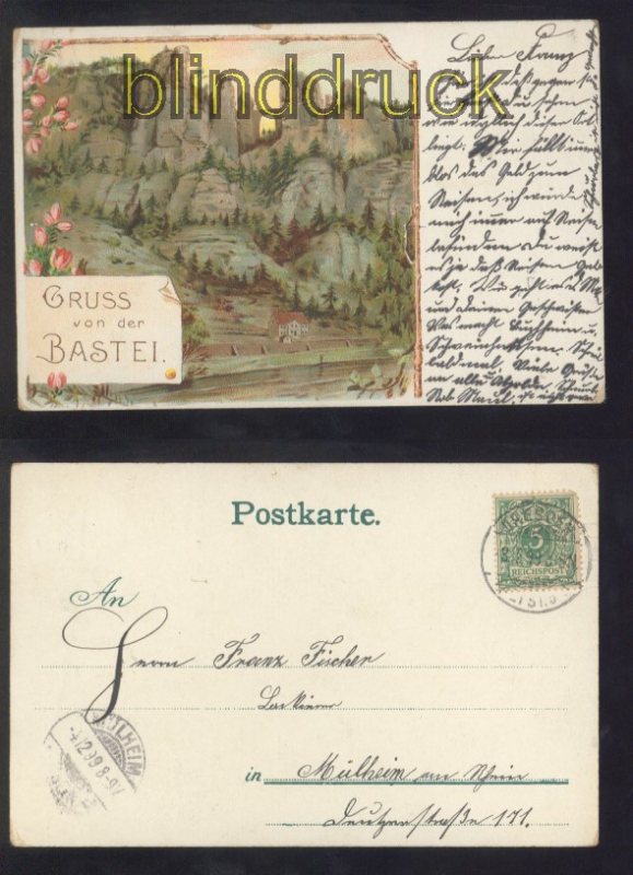 Sachsen Sächs. Schweiz sw-AK Gruss von der Bastei 1899 Karte gelaufen aus Dresden 3.2.1899 nach Mülheim am Rhein Erhaltung siehe Scan