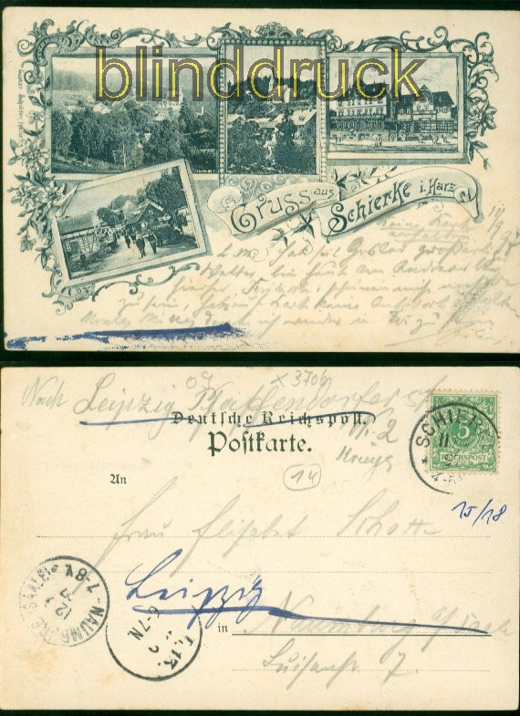 Sachsen-Anhalt Gruss aus Schierke i. Harz sw-AK vier Ansichten 1897 nach Naumburg vier Ansichten: Schierke, Kirche, Hoppes Gasthaus und Pension, Strassenansicht Karte gelaufen aus Schierke i. Harz 11.9.1897 nach Naumburg Weiterleitung nach Leipzig Ankunftsstempel Erhaltung siehe Scan