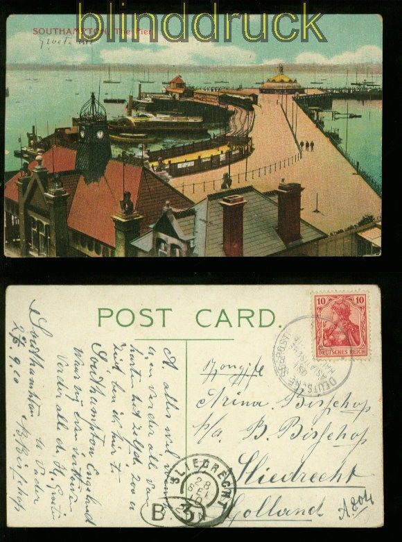 Deutsche Seepost Ostasiatische Hauptlinie 1910 farb-AK Southampton farb-Ansichtskarte Southampton The Pier Deutsche Seepost Ostasiatische Hauptlinie Karte gelaufen 27.9.1910 nach Sliedrecht in Holland Ankunftsstempel Erhaltung siehe Scan