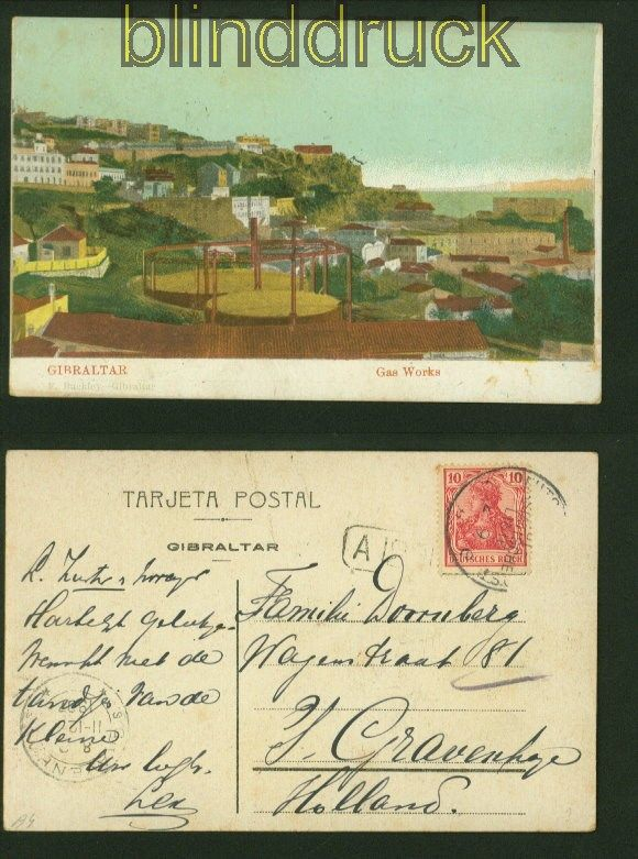 Deutsche Seepost Ostasiatische Linie 1907 farb-AK Gibraltar farb-Ansichtskarte Gibraltar Gas Works Gas-Werke Deutsche Seepost Ostasiatische Linie Karte gelaufen 2.9.1907 nach s´Gravenhage Ankunftsstempel Erhaltung siehe Scan