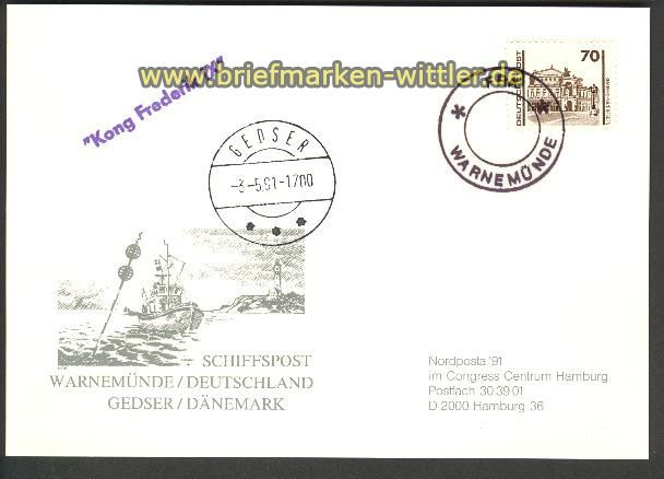 Deutsche Schiffspost Ostsee Kong Frederik IX Warnemünde - Gedser Schiffsstempel Fra Warnemünde Gedser 3.5.1991 auf Blanko-Karte einwandfreie Erhaltung siehe Scan