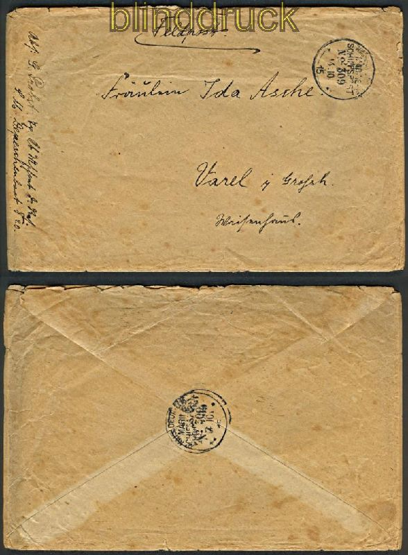 Deutsches Reich Marine-Schiffspost MSP # 306 Torpedoboot T 20 1915MSP # 309 Torpedoboot T 20 Depeschenbootgelaufen als Feldpostbrief 14.10.1915 nach Varel T 20 mit 16 Mann Besatzung Brief getönt und mit RandmängelErhaltung siehe Scan1310