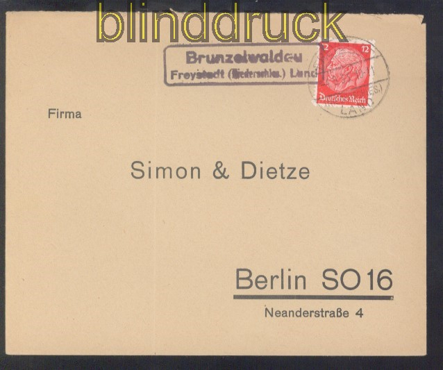 Deutsches Reich Schlesien Landpoststempel Brunzelwaldau Freystadt (Niederschles.) Land 1933 mit Landpoststempel Brunzelwaldau Freystadt (Niederschles.) Land Brief gelaufen aus Freystadt 4.9.1933 nach Berlin Erhaltung siehe Scan