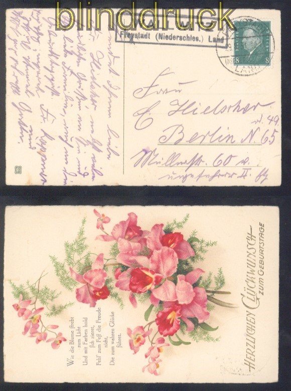 Deutsches Reich Schlesien Landpoststempel Wallwitz Freystadt (Niederschles.) Land 1931 auf Glückwunschkarte zum Geburtstag mit Landpoststempel Wallwitz Freystadt (Niederschles.) Land Karte gelaufen aus Freystadt 29.8.1931 nach Berlin Erhaltung siehe Scan