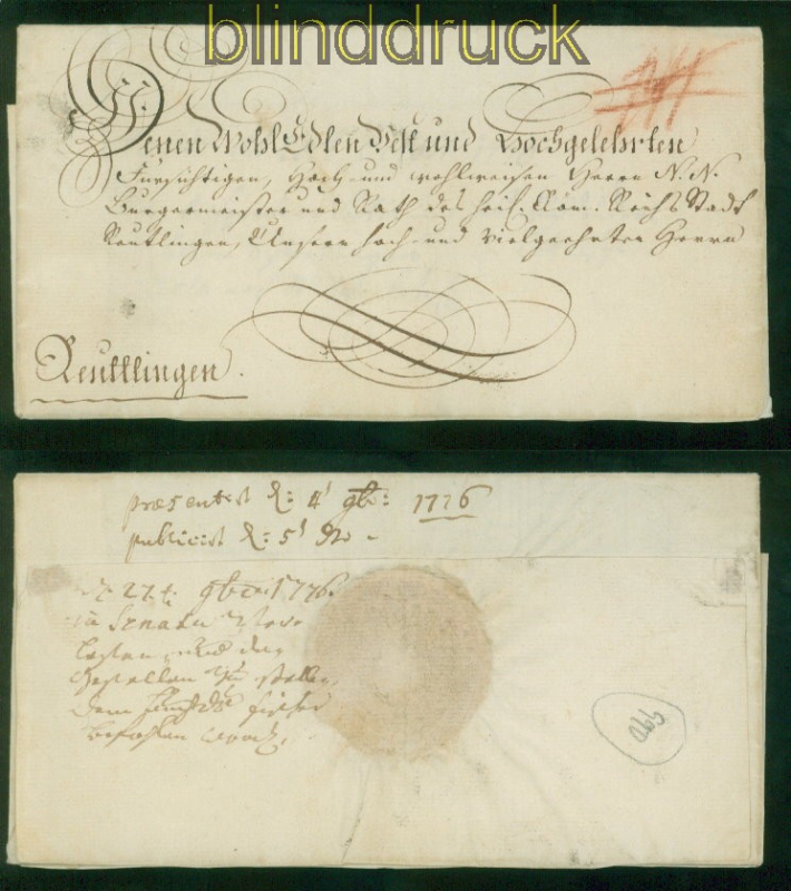 Schnörkelbrief Stuttgart 25.10.1776 nach Reutlingen ohne Inhalt schöner alter Schnörkelbrief aus dem Jahr 1776 Erhaltung siehe Scan
