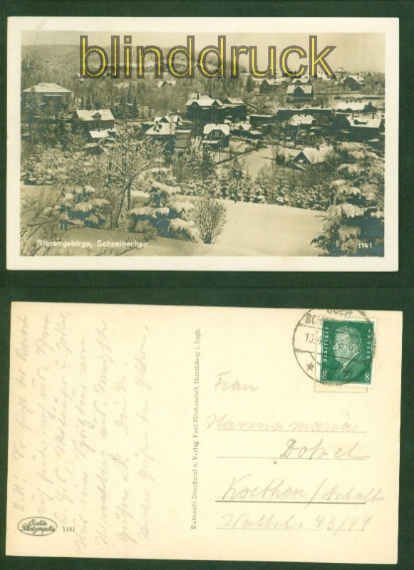Schlesien Schreiberhau Riesengebirge sw-AK Totalansicht 1929 nach Koethen Karte gelaufen aus Oberschreiberhau 10.4.1929 nach Koethen Erhaltung siehe Scan