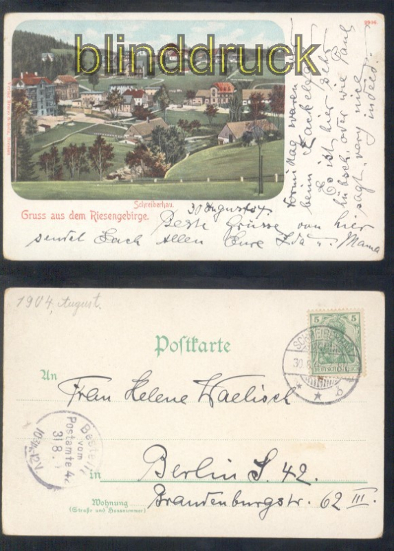 Schlesien Schreiberhau farb-AK Gruss aus dem Riesengebirge 1904 Karte gelaufen aus Schreiberhau 30.08.19804 nach Berlin Erhaltung siehe Scan