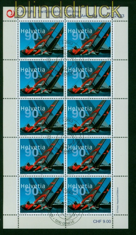 Schweiz Mi # 1831 Sonderstempel Kleinbogen America’s Cup 2003 Gewinn der Segelregatta um den America’s Cup 2003 durch die Schweizer Segeljacht „Alinghi“ Kleinbogen mit Sonderstempel Erhaltung siehe Scan