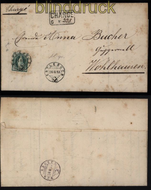 Schweiz Mi # 59 EF Einschreiben Entlebuch 26.2.1883 nach Wohlhausen 25 C grün stehende Helvetia als Einzelfrankatur auf Einschreiben mit Charge-Stempel gelaufen aus Entlebuch 26.2.1883 nach Wohlhausen Erhaltung siehe Scan