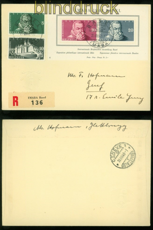Schweiz Mi # Block 13 MiF IMABA-Ausstellungs-R-Brief 25.8.1948 Blockausgabe: Internationale Briefmarkenausstellung IMABA Basel 1948 mit Zusatzfrankatur MiF auf IMABA-Ausstellungs-R-Brief mit Sonderstempel der Ausstellung 25.8.1948 nach Genf Erhaltung siehe Scan
