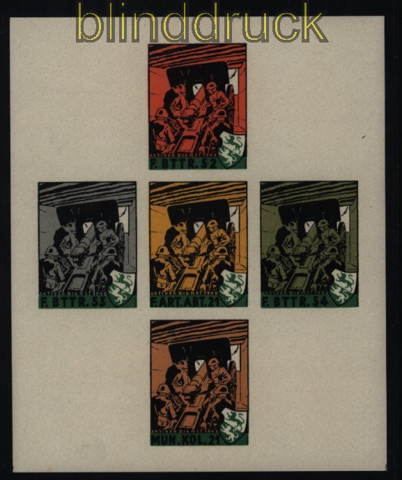 Schweiz Soldatenmarke Artillerie Blockausgabe von 5 Marken postfrisch geschnitten Soldatenmarke Kleinboenn mit fünf Marken geschnitten aktiver Dienst 1940 F.BTTR. 52, F.BTTR. 53, F.ART.ABT. 21, F.BTTR.54 und MUN.KOL.21 postfrisch Erhaltung siehe Scan