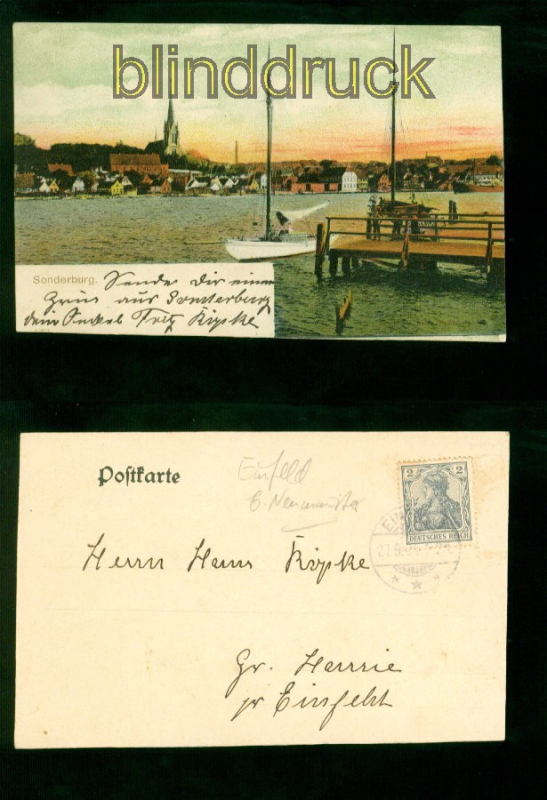 Nordschleswig Sonderburg farb-AK Gesamtansicht 1907 Ortskarte Einfeld Karte gelaufen als Ortspostkarte Einfeld 27.9.1907 Erhaltung siehe Scan