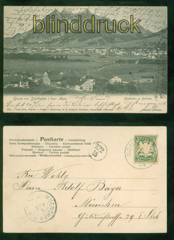Bayern Gruss aus Sonthofen i. bayr. Allgäu sw-AK Gesamtansicht mit Grünten 1904 nach München Karte gelaufen aus Sonthofen 31.7.1904 nach München Erhaltung siehe Scan