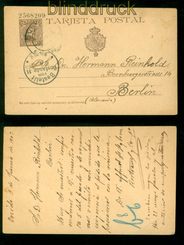 Spanien GSK P 35 II gestempelt Oviedo 3.6.1909 nach Berlin 10 Cent braun Ganzsachenkarte Type II gelaufen aus Oviedo 3.6.1909 nach Berlin Erhaltung siehe Scan