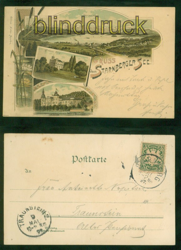 Bayern Gruss vom Starnberger See Litho-AK drei Ansichten 1897 nach Traunstein drei Ansichten: Totalansicht, Schloss Berg und Leoni Karte gelaufen aus Starnberg 9.5.1897 nach Traunstein Erhaltung siehe Scan