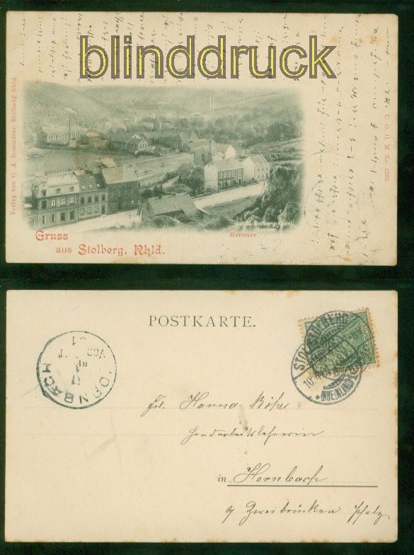 Nordrhein-Westfalen Gruss aus Stolberg, Rhld. sw-AK Hammer 1901 nach Hornbach Karte gelaufen aus Stolberg 10.4.1901 nach Hornbach Erhaltung siehe Scan