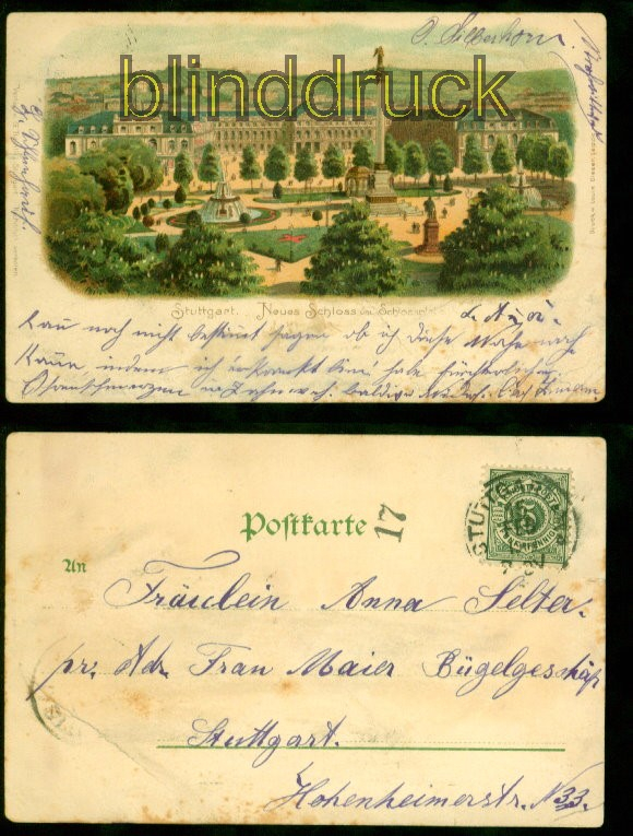 Baden-Württemberg Stuttgart Litho-AK Neues Schloss mit Schlossplatz 1900 Ortspostkarte Karte gelaufen als Ortspostkarte Stuttgart 15.2.1900 Ankunftsstempel Karte mit mehreren Bügen Erhaltung siehe Scan