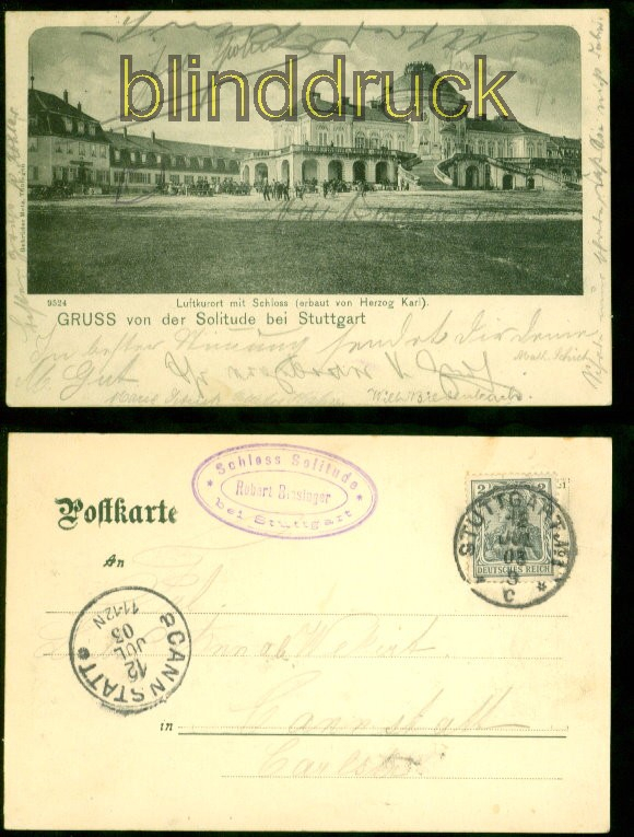 Baden-Württemberg Stuttgart sw-AK Gruss von der Solitude 1903 nach Cannstatt Karte gelaufen aus Stuttgart 12.7.1903 nach Cannstatt Ankunftsstempel Erhaltung siehe Scan
