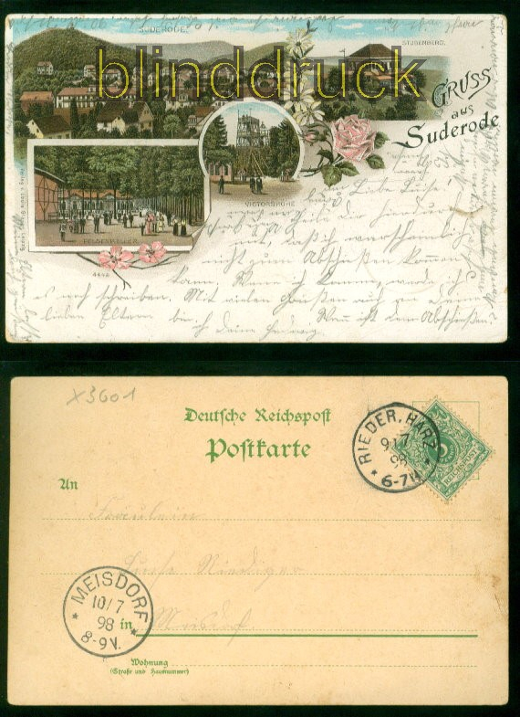 Sachsen-Anhalt Gruss aus Suderode Litho-AK vier Ansichten 1898 nach Meisdorf vier Ansichten: Suderode, Stubenberg, Felsenkeller und Victorshöhe Karte gelaufen aus Rieder, Harz 9.7.1898 nach Meisdorf Ankunftsstempel Erhaltung siehe Scan