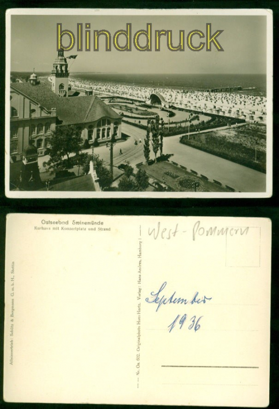Pommern Swinemünde Ostseebad sw-AK Kurhaus mit Konzertplatz und Strand ungebraucht handschriftlich datiert auf September 1936 Karte nicht gelaufen Erhaltung siehe Scan