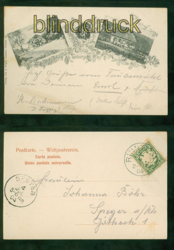 Rheinland-Pfalz Taubensuhl sw-AK Gruss vom Taubensuhl 2 Ansichten 1904 nach Speyer Karte gelaufen aus Rinnthal 4.7.1904 nach Speyer Ankunftsstempel Erhaltung siehe Scan