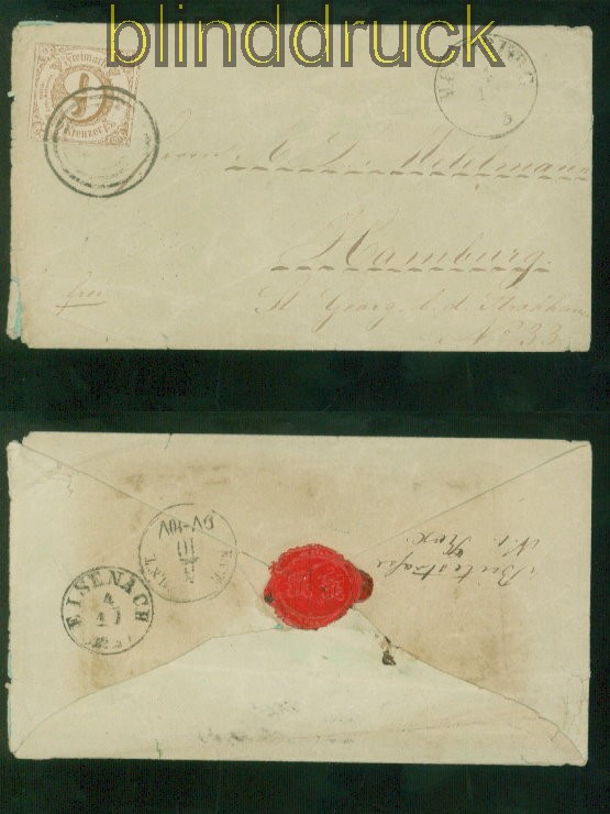 Altdeutschland Thurn & Taxis Mi # 34 EF aus Heldburg nach Hamburg 9 Kreuzer braun weißes Papier geschnitten entwertet mit Vierringstempel 179 gelaufen aus Heldburg nach Hamburg Ankunftsstempel Brief knittrig und verklebt Erhaltung siehe Scan