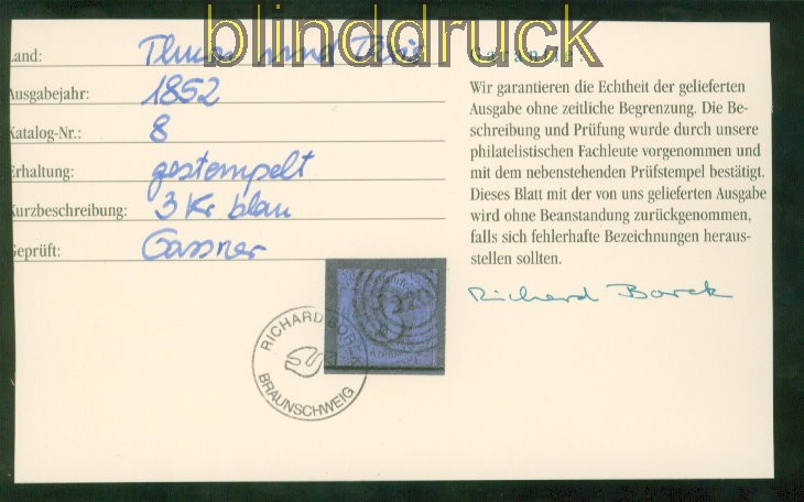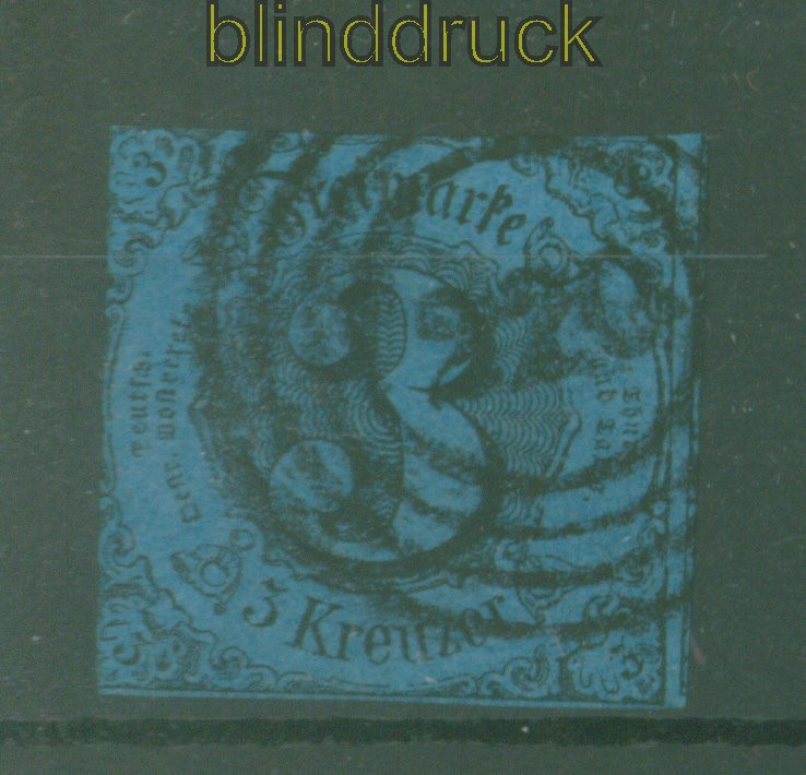 Altdeutschland Thurn & Taxis Mi # 8 gestempelt Nummernstempel 220 3 Kreuzer geschnitten schwarz auf blau entwertet mit Nummernstempel 220 für Frankfurt Erhaltung siehe Scan