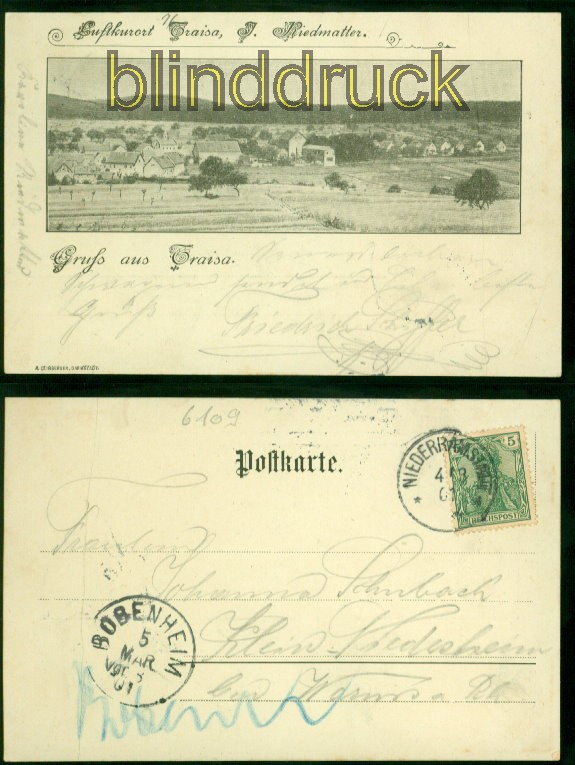 Hessen Gruss aus Traisa sw-AK Luftkurort Traisa J. Riednatter 1901 nach Klein-Niedesheim Karte gelaufen aus Niederramstadt 4.3.1901 nach Klein-Niedesheim Ankunftsstempel Erhaltung siehe Scan