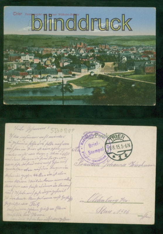 Rheinland-Pfalz Trier farb-AK Totalansicht mit Kaiser-Wilhelm-Brücke Feldspost 1915 nach Oldenburg Karte gelaufen mit Feldpost aus Trier 9.8.1915 nach Oldenburg Erhaltung siehe Scan
