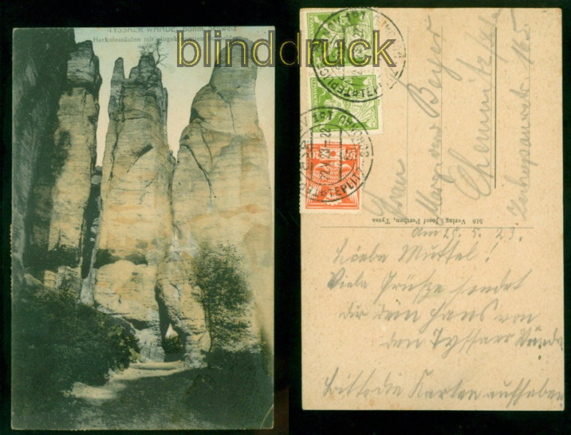 Böhmen Tyssaer Wände farb-AK Herklulessäulen Teplitz-Schönau 1923 nach Chemnitz Herkulessäulen mit eingeklemmten Schneider Karte gelaufen aus Teplitz-Schönau 22.5.1923 nach Chemnitz Erhaltung siehe Scan