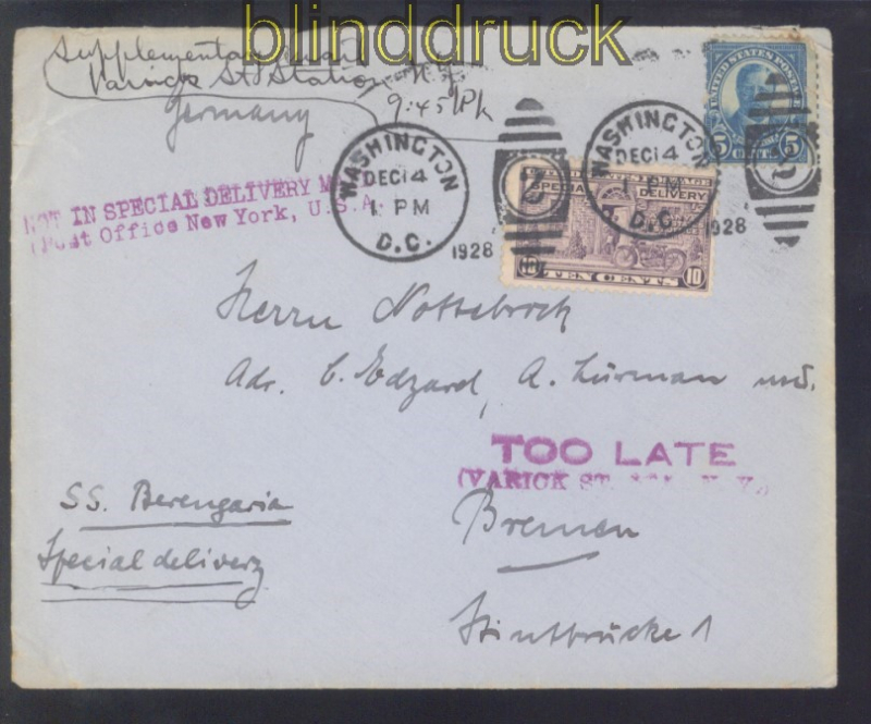 USA Auslands-Luftpost-Brief Spezial delivery too late 1928 SS. Berengaria Auslands-Luftpost-Brief handschriftlicher Vermerk : Special delivery SS. Berengaria handschriftlicher Vermerk: Supplementary mail / Varick St. Station N.Y. 9:45 PM blauer L2L TOO LATE / (VARICK STATION N.Y.) blauer L2: NOT IN SPECIAL DELIVERY MAID / Post Office New York, U.S.A Brief gelaufen aus Washington 14.12.1928 nach Bremen Brief mit Spuren Erhaltung siehe Scan