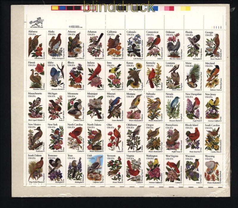 USA Mi # 1532/81 F postfrischer Zusammendruckbogen Vögel und Blumen im Folder Vögel und Blumender 50 Bundesstaaten kompletter postfrischer Zusammendruckbogen in Zähnung L 10 3/4 / 11 1/4 ungefaltet im Folder im Originalumschlag mit Vordruckblatt zum Einkleben der Einzelmarken Schutztaschen für die Marken liegen ebenfalls bei Erhaltung siehe Scan