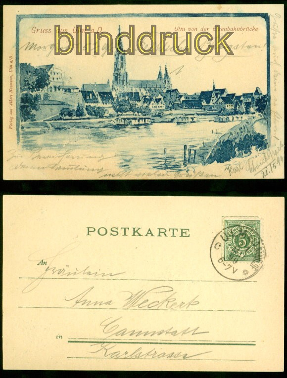 Baden-Württemberg Gruss aus Ulm a. D. sw-AK Ulm von der Eisenbahnbrücke 1899 nach Cannstatt Karte gelaufen aus Ulm 21.5.1899 nach Cannstatt Erhaltung siehe Scan