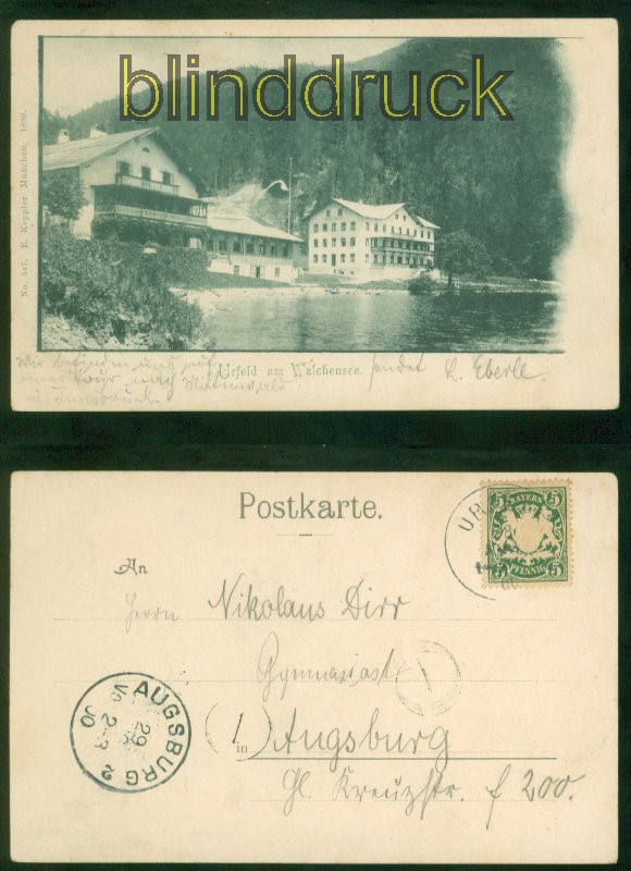 Bayern Urfeld am Walchensee sw-AK 28.8.1900 nach Augsburg Karte gelaufen aus Urfeld 28.8.1900 nach Augsburg Ankunftsstempel Erhaltung siehe Scan